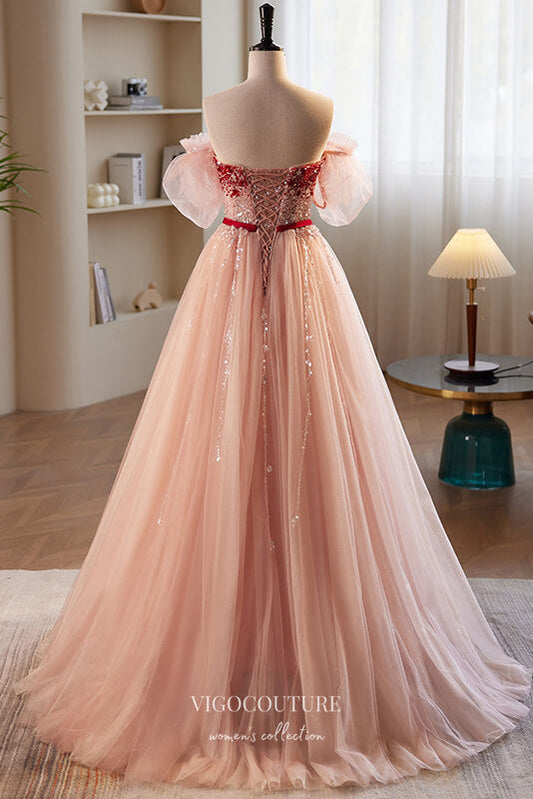 Pink Beaded Tulle Prom Dress with Removable Puffed Sleeve 22306