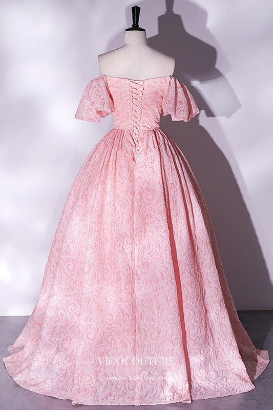 Pink Jacquard Satin Prom Dress with Off-the-Shoulder Design 22301