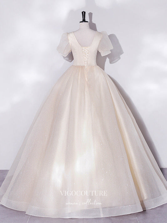 Shimmering Champagne Sparkly Tulle Prom Dress with Puffed Sleeve 22299