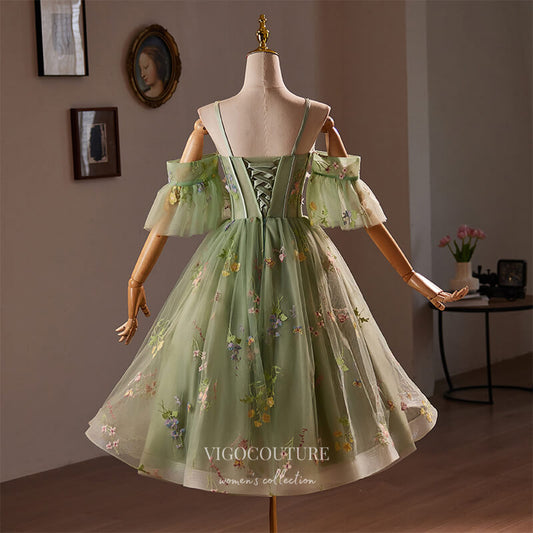 Light Green Floral Lace Hoco Dresses Puffed Sleeve Tea-Length Dress hc250