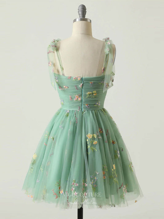 Light Green Lace Applique Homecoming Dress Spaghetti Strap Floral Short Prom Dress 24462
