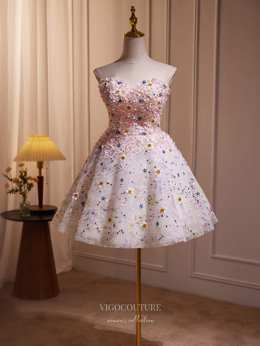 Pink Floral Sequin Lace Homecoming Dress Strapless Short Prom Dress hc302