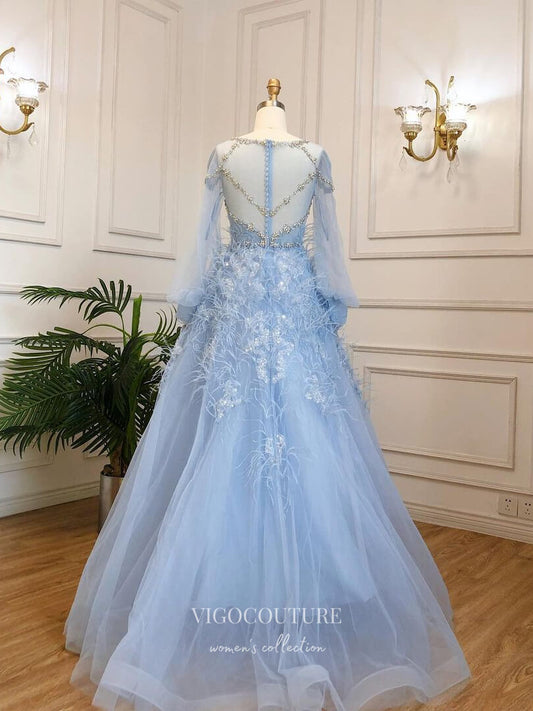Light Blue Beaded Feather Prom Dresses Long Puffed Sleeve Evening Dress 22100