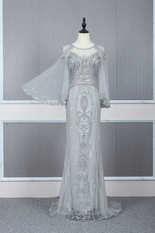 Silver Beaded Prom Dresses Long Sleeve Evening Dresses 20765