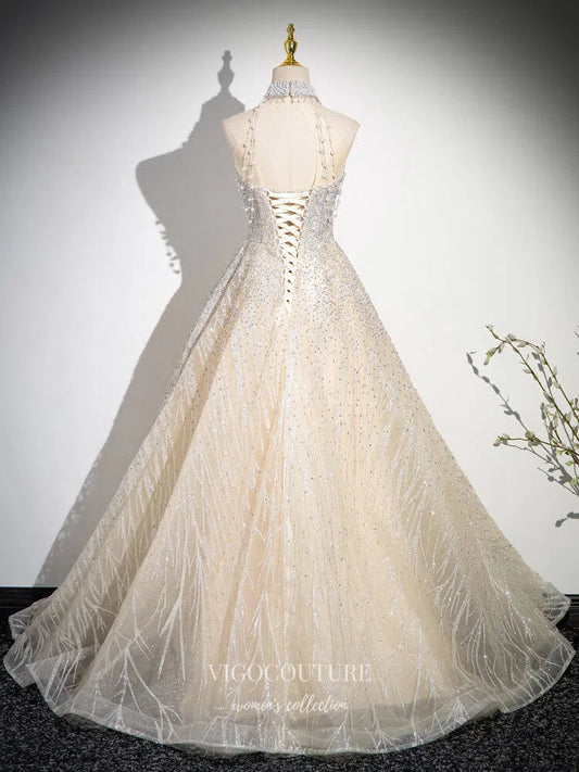 Champagne Beaded Lace Pearl Prom Dresses Halter Neck Formal Dress 25079
