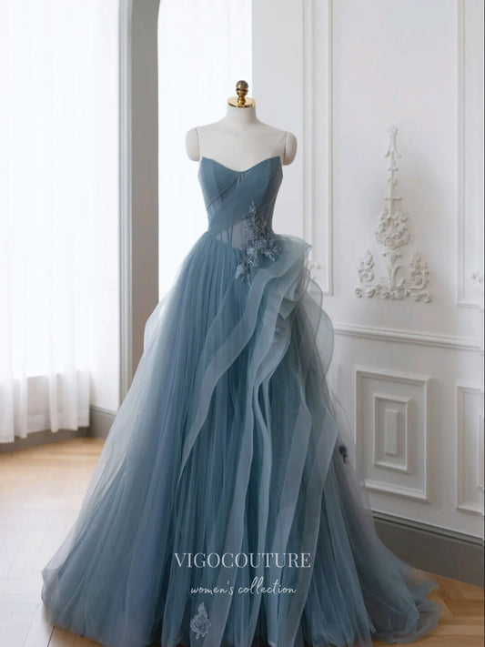 Dusty Blue Prom Dresses Tiered Lace Applique Formal Dresses 21174