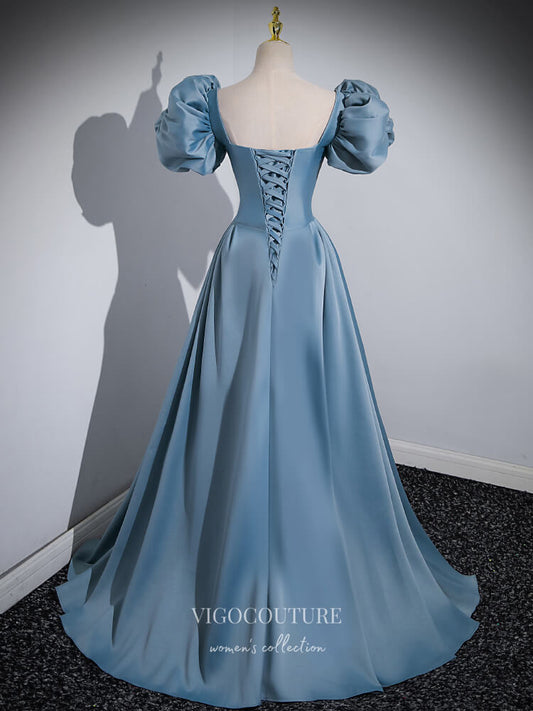 Dusty Blue Satin Cheap Prom Dresses Puffed Sleeve Formal Gown 24425