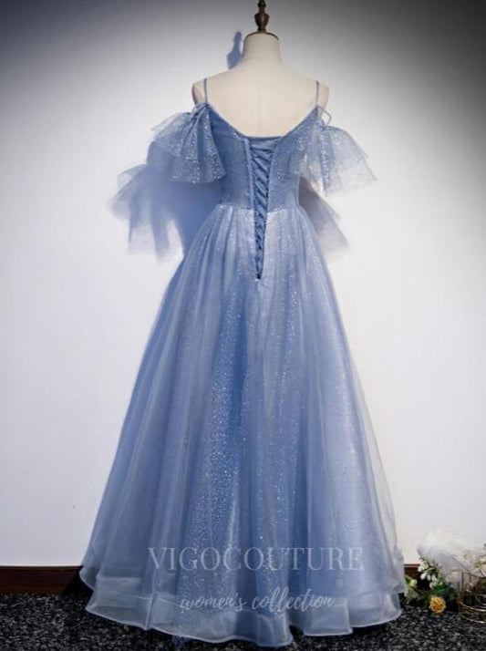 Dusty Blue Sparkly Tulle Prom Dress 2022 Off the Shoulder Formal Dress 20495