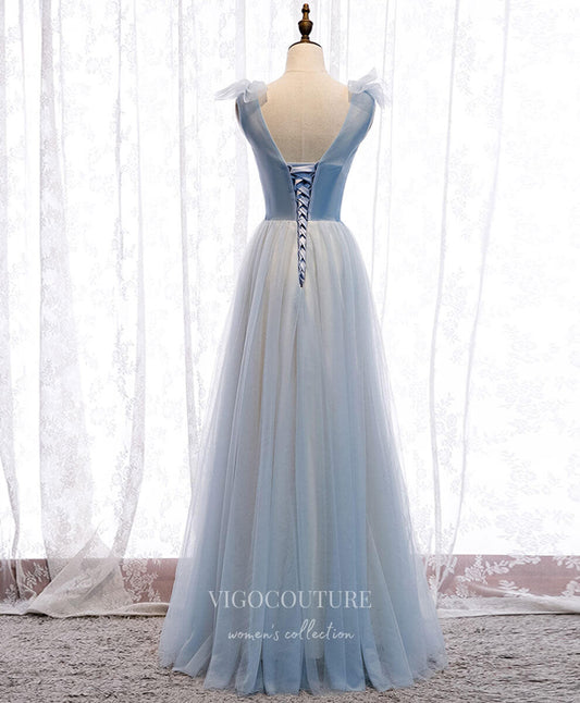 Dusty Blue Tulle Prom Dresses V-Neck Evening Dress 21821