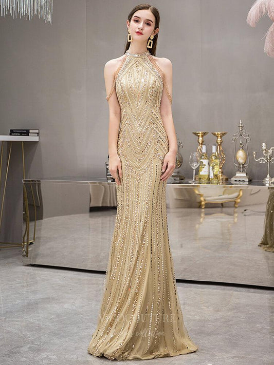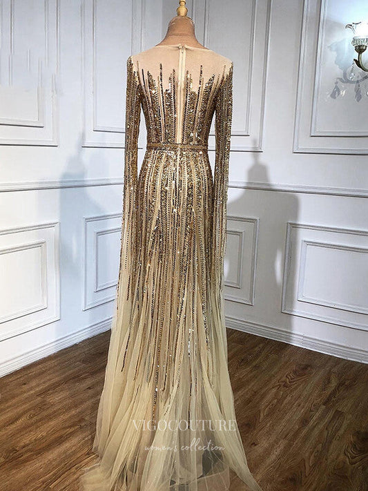 Gold Extra Long Sleeve Prom Dresses Beaded Formal Dresses 21305