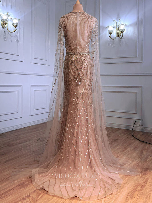 Gold Extra Long Sleeve Prom Dresses Beaded Mermaid Formal Dresses 21300