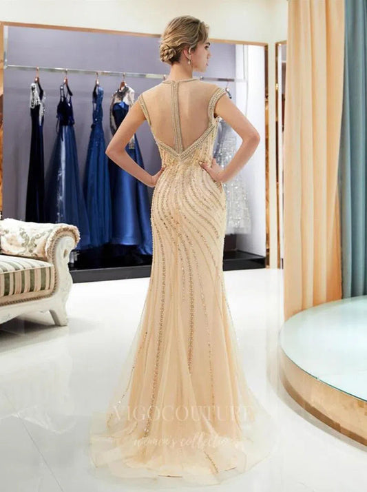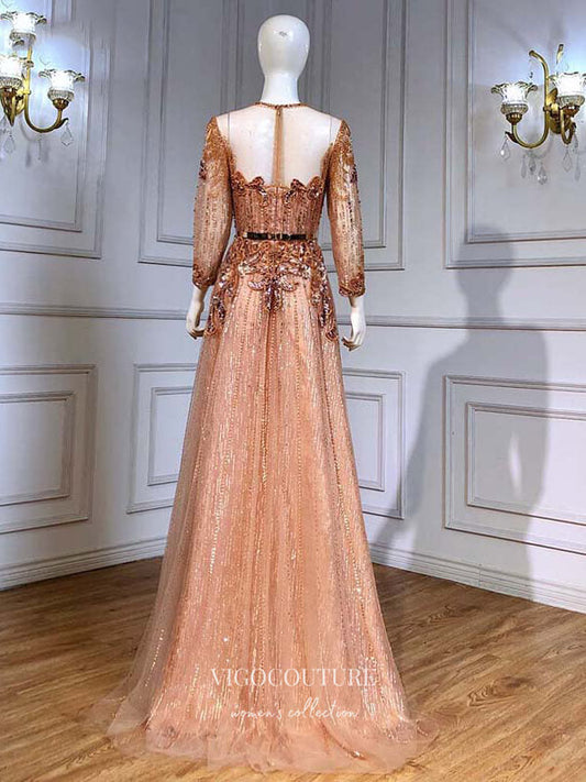Gold Long Sleeve Formal Dresses Beaded Round Neck Evening Dresses 21527