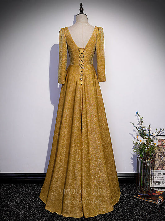 Gold Sparkly Lace Long Sleeve Prom Dress 20897