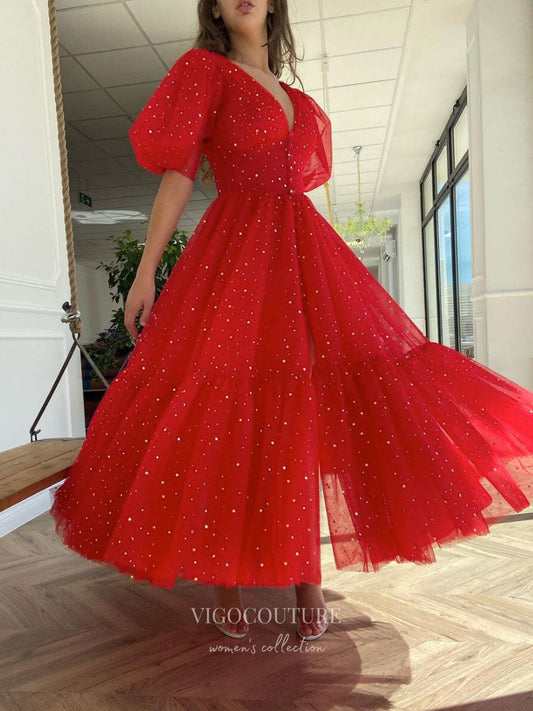 Red Starry Tulle Prom Dresses Tea-Length Puffed Sleeve Short Formal Dress 21831