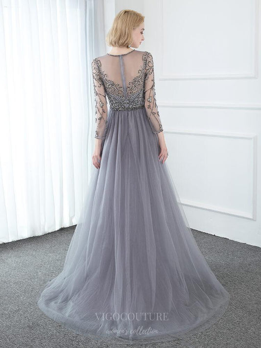 Beaded Round Neck Long Sleeve Prom Dresses 20750
