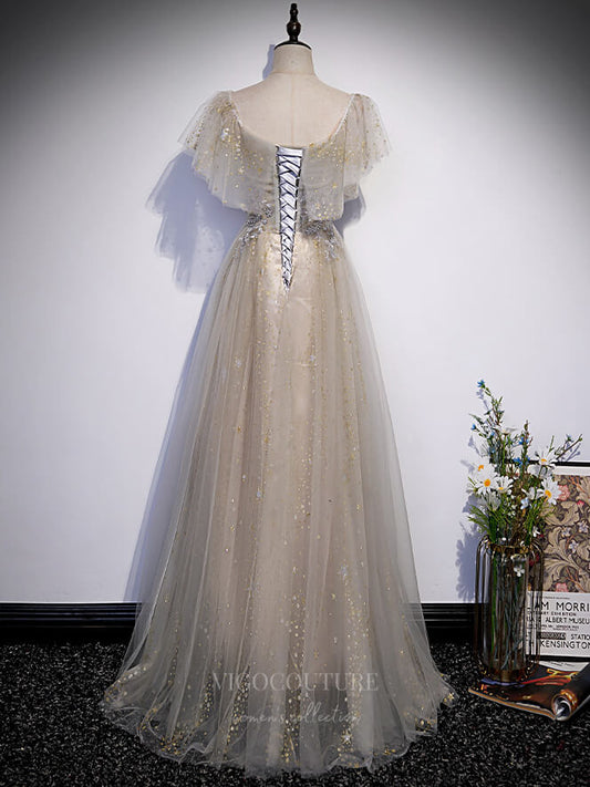 Grey Sparkly Tulle Prom Dresses with Gold Lace, Off the Shoulder Formal Dresses SU008