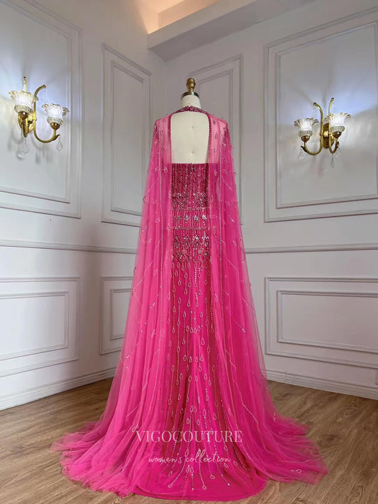 Magenta Beaded Prom Dresses Cape Sleeve 1920s Pageant Dress 22121