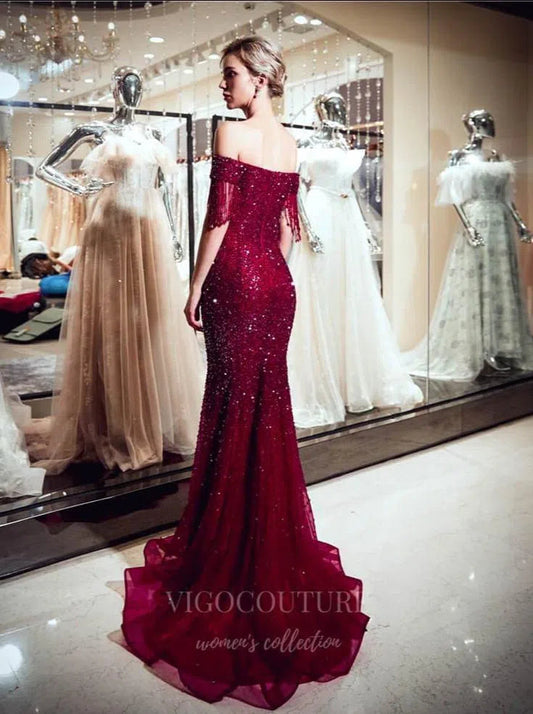 Beaded Off the Shoulder Mermaid Prom Dresses Overskirt Pageant Dress 24528