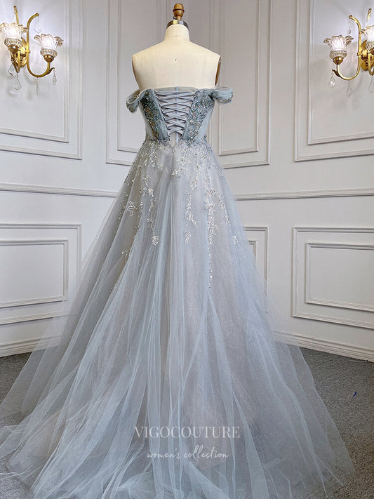 Dusty Blue Sparkly Tulle Prom Dress 2022 Off the Shoulder Formal Dress 20495