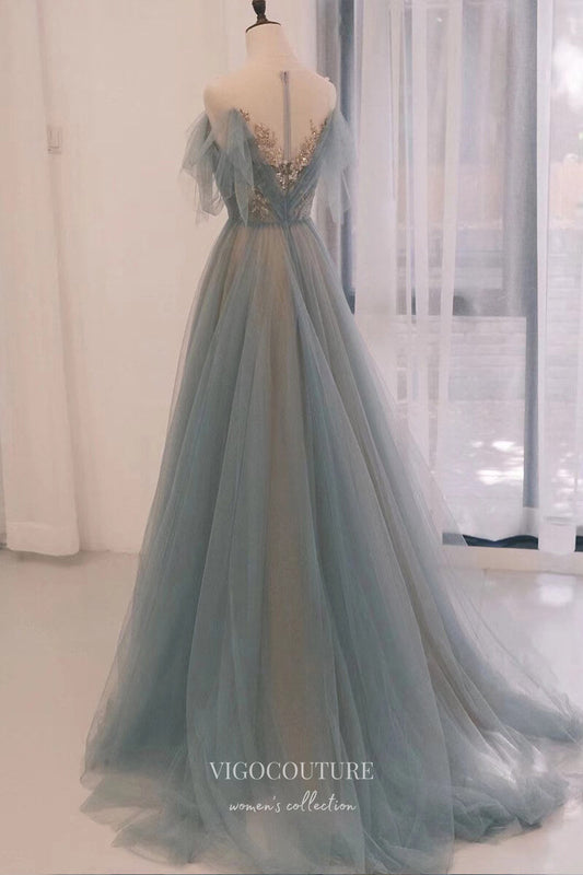 Dusty Blue Prom Dresses Beaded Tulle Formal Dresses 21444