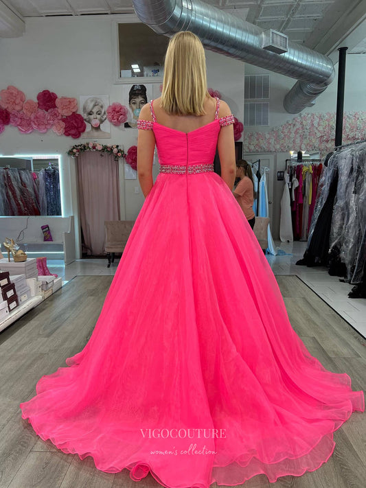 Hot Pink Organza Off the Shoulder Prom Dresses Beaded Waist Pleated Bodice 24223