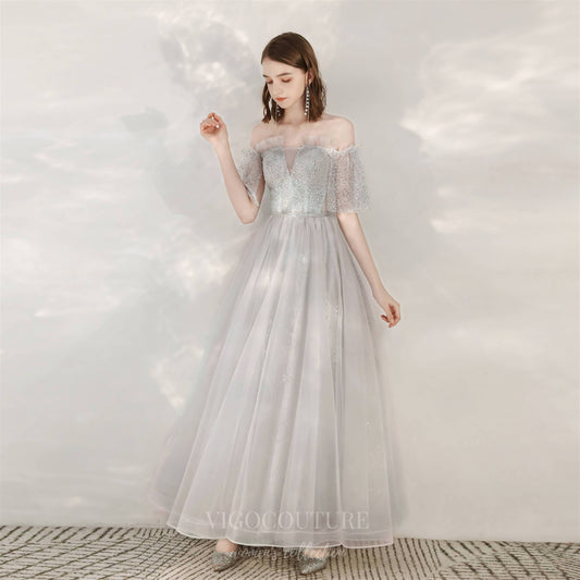 Grey Sparkly Tulle Prom Dresses Off the Shoulder Bow Evening Gown 24416