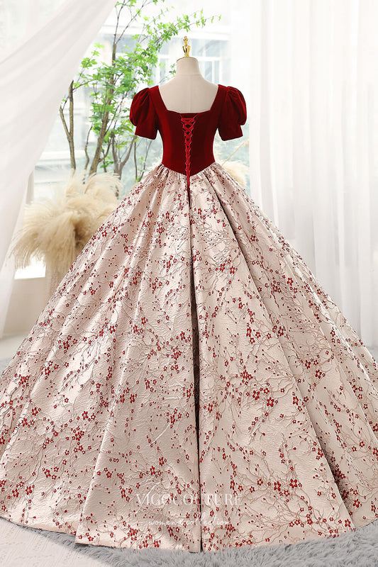 Stunning Jacquard Satin and Velvet Prom Dress with Puffed Sleeves 22283