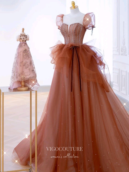 Brown Puffed Sleeve Prom Dresses Beaded Formal Dresses 21176