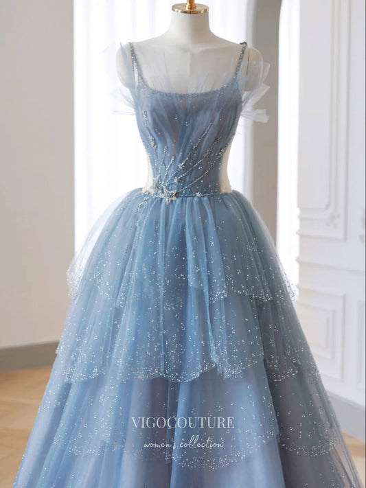 Light Blue Beaded Prom Dresses Spaghetti Strap Formal Dresses 21178