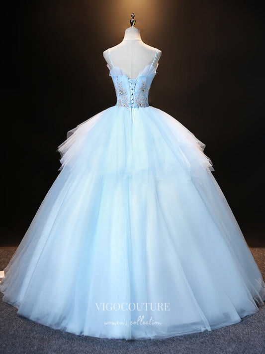 Light Blue Lace Applique Prom Dresses Tiered V-Neck Formal Dresses 21535