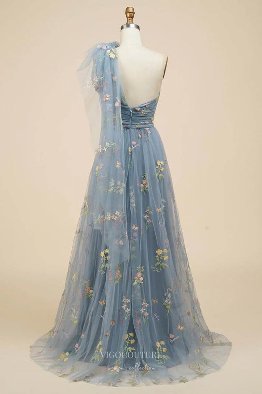 Dusty Blue Lace Applique Prom Dresses Bow Tie One Shoulder 24461