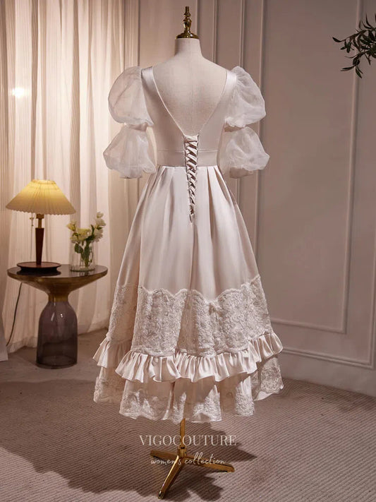 Elegant Lace Satin Prom Dresses Puffed Sleeve Tea-Length Dress hc254