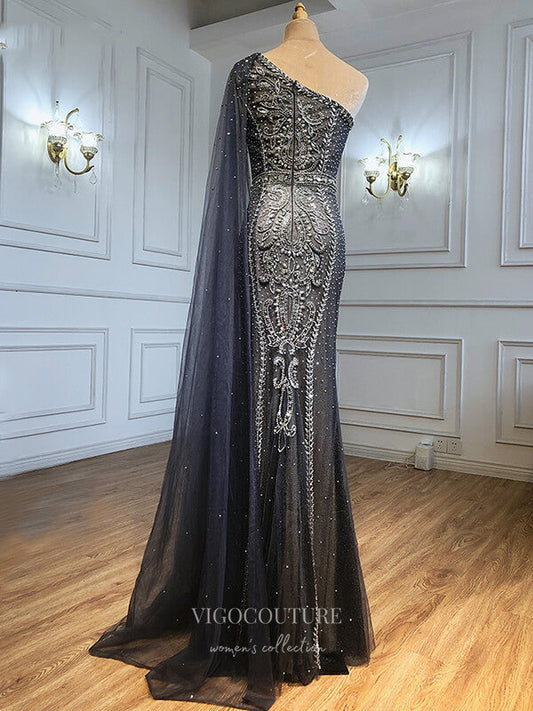 Grey Beaded Mermaid Prom Dresses One Shoulder Formal Dresses 21235