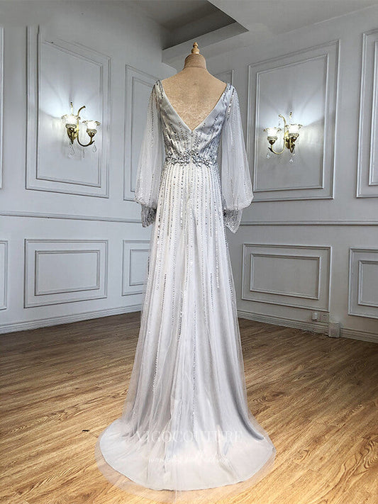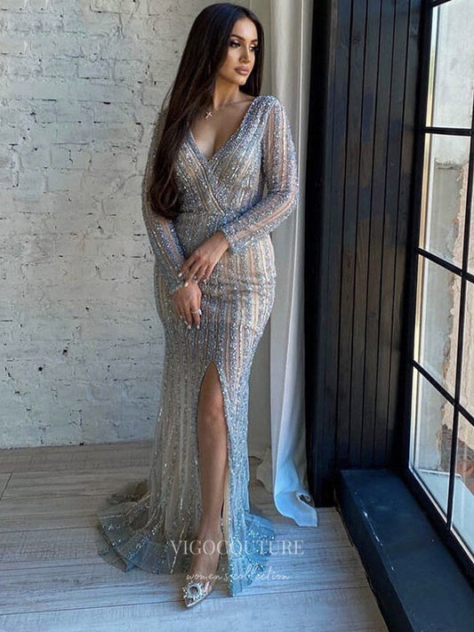 Beaded Plunging V-Neck Prom Dresses Long Sleeve Formal Dresses 21236
