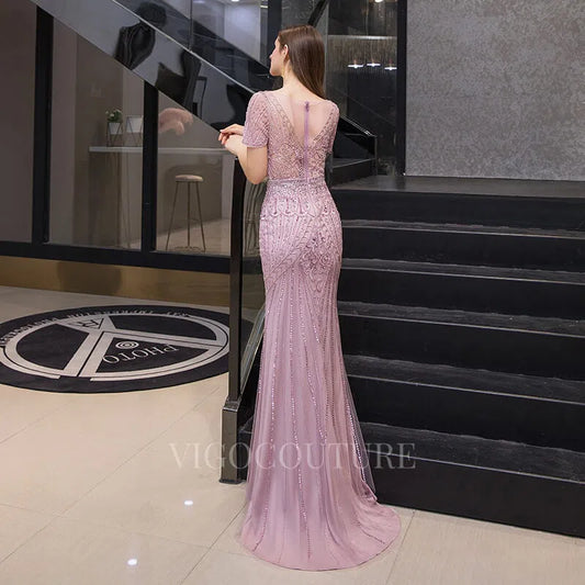 Beaded Mermaid Short Sleeve Prom Dresses 20080