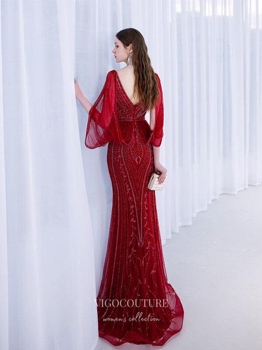 Beaded Mermaid V-neck Prom Dresses Batwing Sleeve Prom Dresses 20053-b