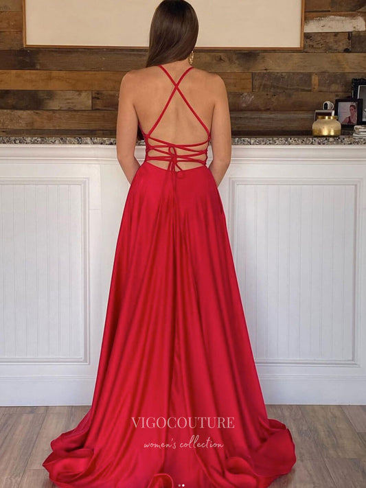 Red Satin Prom Dresses With Slit Spaghetti Strap Evening Dress 21850