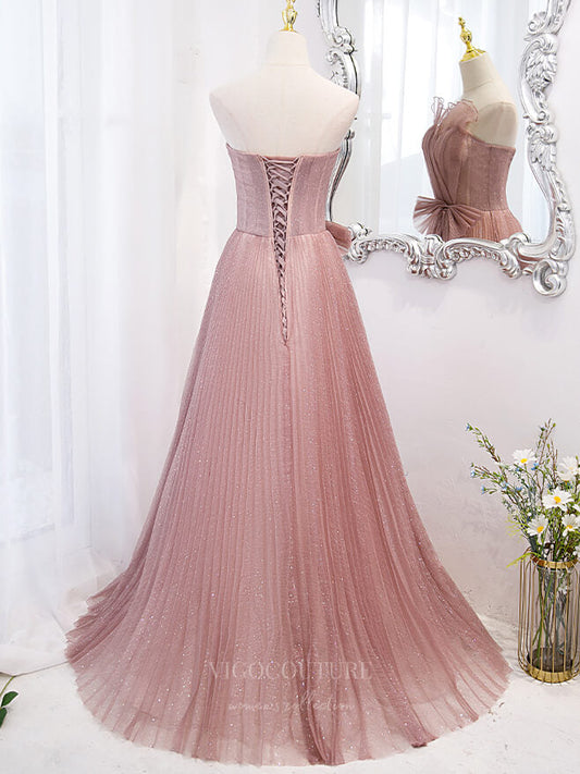 Sparkling Pink Strapless Prom Dress with Lace Applique Bodice and Slit 22194