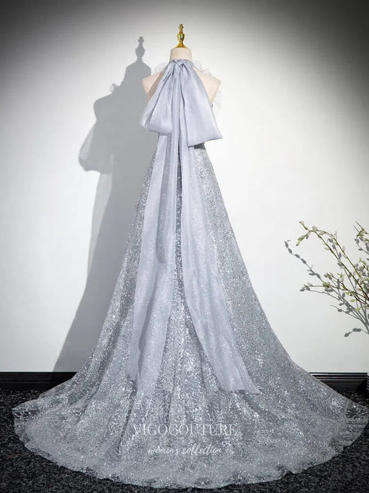 Silver Halter Neck Ruffled Prom Dresses Shimmering Tulle Evening Dress 25078