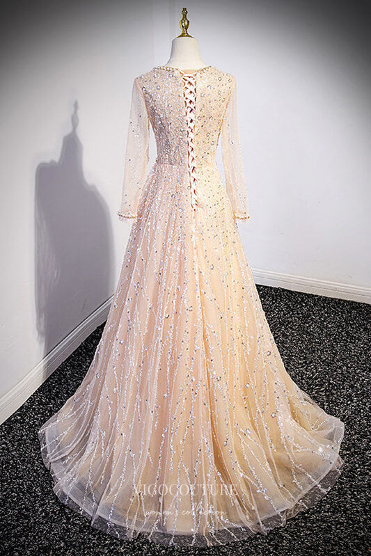 Champagne Beaded Prom Dress with Long Sleeve and Square Neck 22264