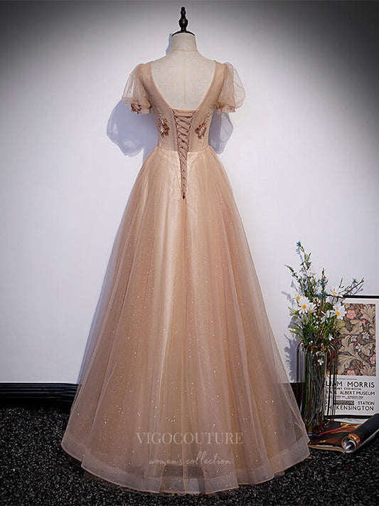 Champagne Tulle Prom Dresses Puffed Sleeve Formal Dresses 21502