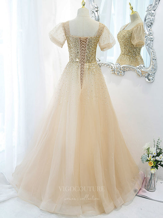 Champagne Sequin Tulle Puffed Sleeve Prom Dress 20876