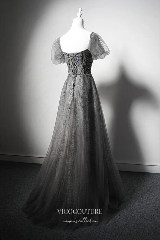 Elegant Grey Beaded Prom Dress with Puffed Sleeve 22377