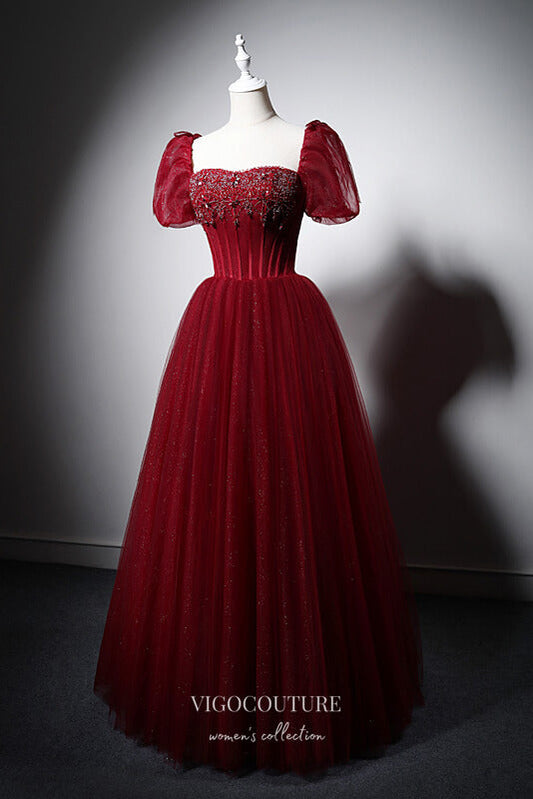 Elegant Red Beaded Prom Dresses with Puffed Sleeve 22365