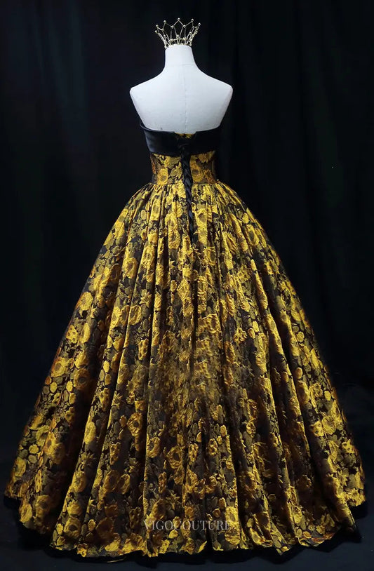 Yellow Floral Jacquard Prom Dresses Strapless Quinceanera Dresses SU079