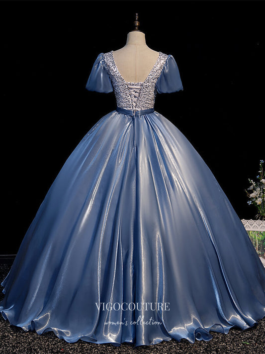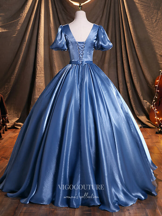 Dusty Blue Satin Quinceanera Dresses Puffed Sleeve Sweet 15 Dresses 21386