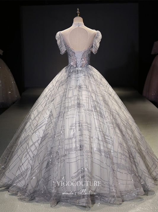 Grey Sequin Prom Dresses with Short Sleeve, Sparkly Quinceanera Dresses BG031