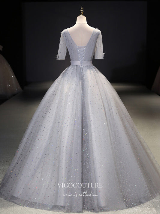 Grey Sparkle Prom Dresses with Puffed Sleeve, V-Neck, Quinceanera Dresses BG040