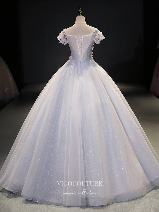 Lavender Sparkly Tulle Prom Dresses with Bow, Puffed Sleeve, Velvet Bodice, Quinceanera Dresses BG011
