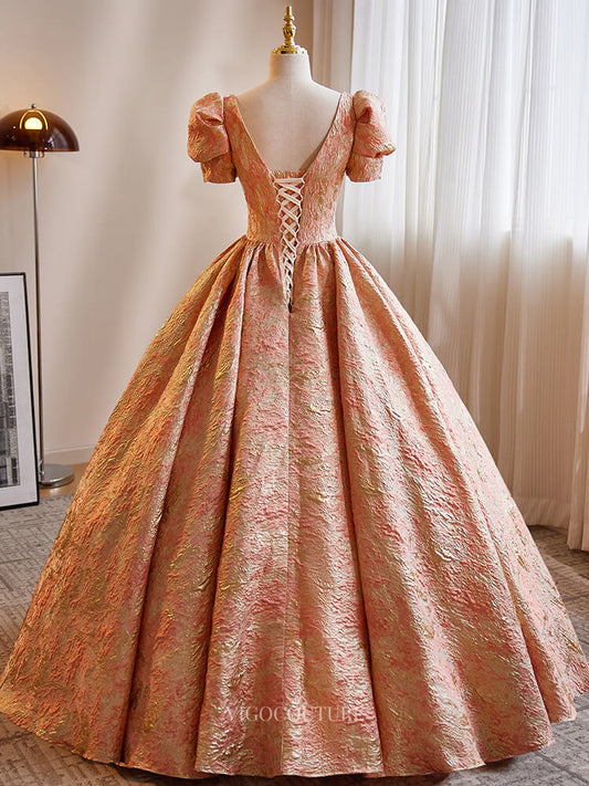 Blush Jacquard Prom Dresses with Puffed Sleeve, Corset Back, Quinceanera Dresses BG018